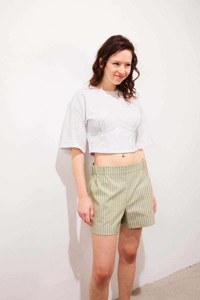 CAPRIO est un petit short à rayures, à la coupe droite et à la taille haute, pensé pour une silhouette décontractée et équilibrée. La taille élastiquée recouverte apporte un confort immédiat, tandis que la ligne nette structure la jambe avec simplicité. Les poches discrètement intégrées dans les coutures côtés renforcent son esprit pratique et épuré. Confectionné en coton, il se porte aussi bien seul qu’en total look avec la chemise assortie, pour une allure Riviera assumée. Un short solaire et rétro, inspiré d’un vestiaire masculin revisité avec légèreté et liberté.