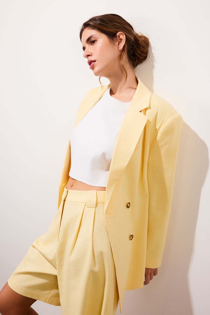 La veste de costume SIMONE adopte une coupe tailleur structurée, pensée pour dessiner la silhouette grâce à ses découpes princesse. Dès qu’on l’enfile, son tombé fluide équilibre la rigueur du costume par une sensation de légèreté et de confort. Le col tailleur et les manches longues affirment une allure nette, tandis que la fente milieu dos accompagne les mouvements avec naturel. Confectionnée dans un mélange de lin et de viscose, doublée de coton, elle se porte aussi bien au quotidien que dans des moments plus habillés. Fermée par de jolis boutons effet corne, elle se porte aussi bien sur un top près du corps que sur une chemise légère. Une veste de caractère, pour une élégance libre et incarnée.