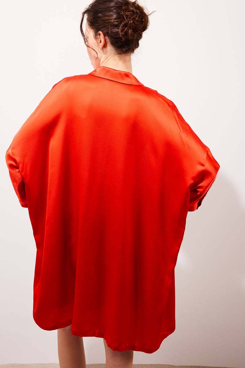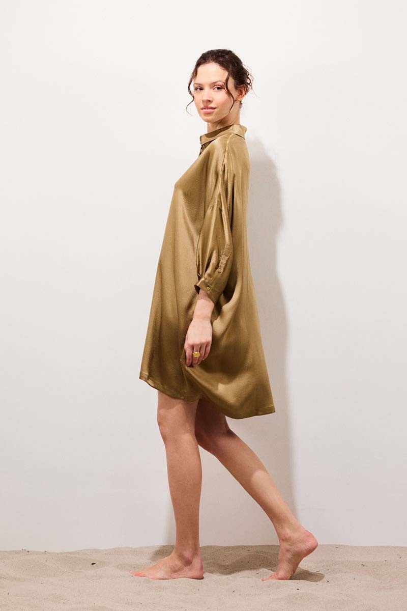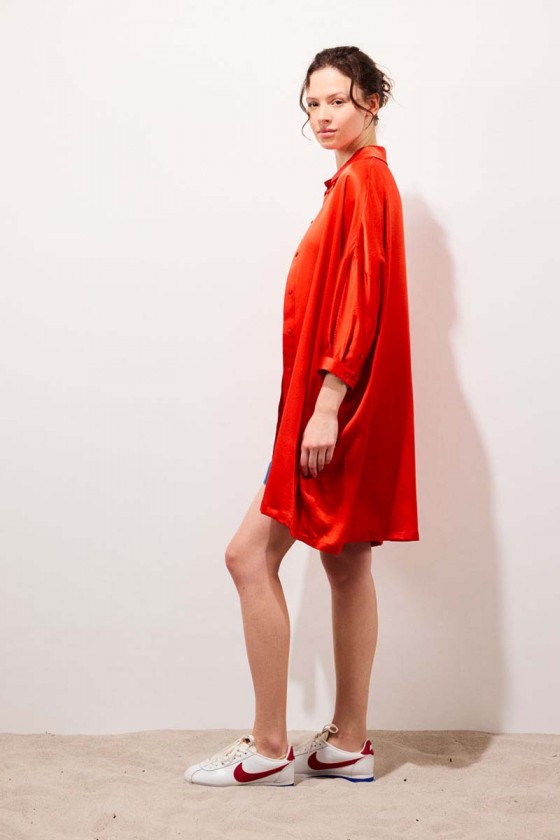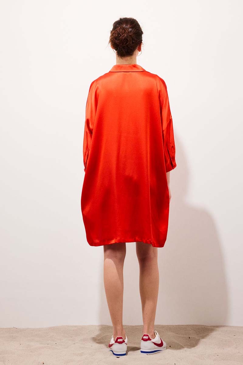 Déclinée en robe courte pour l’été, la MANON conserve tout l’esprit de la chemise iconique qui traverse les saisons chez Karma Koma. Sa coupe ample et fluide glisse naturellement sur le corps, tandis que les épaules tombantes et les manches 3/4 accentuent cette allure libre et décontractée. Confectionnée en soie gaufrée, elle capte la lumière et accompagne chaque mouvement avec fluidité. La patte de boutonnage dissimulée et les poignets boutonnés apportent une structure discrète, équilibrant la légèreté de la matière. Une robe à enfiler sans réfléchir, pensée pour les journées d’été qui s’étirent.