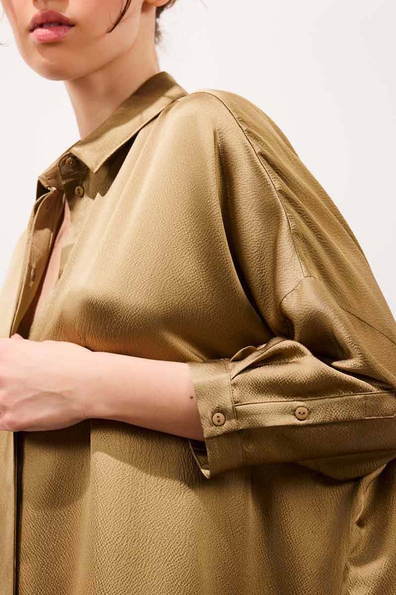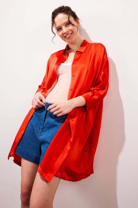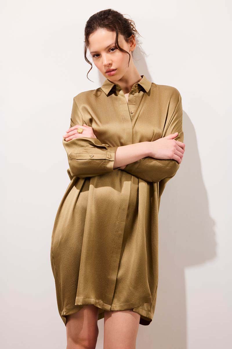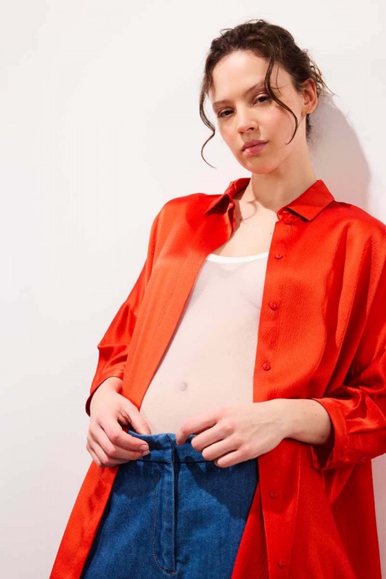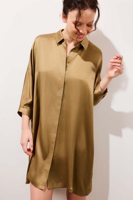 Déclinée en robe courte pour l’été, la MANON conserve tout l’esprit de la chemise iconique qui traverse les saisons chez Karma Koma. Sa coupe ample et fluide glisse naturellement sur le corps, tandis que les épaules tombantes et les manches 3/4 accentuent cette allure libre et décontractée. Confectionnée en soie gaufrée, elle capte la lumière et accompagne chaque mouvement avec fluidité. La patte de boutonnage dissimulée et les poignets boutonnés apportent une structure discrète, équilibrant la légèreté de la matière. Une robe à enfiler sans réfléchir, pensée pour les journées d’été qui s’étirent.